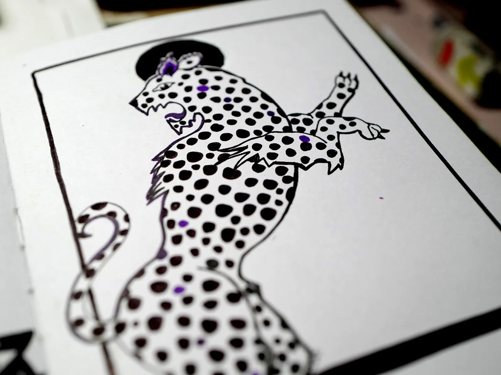 Motif issu de mes carnets de croquis. Pour moi cette linogravure représente une créature mythologique, ici un guépard. N’en déplaise à Ovide ! Tirage original. Édition de 30 + 1 exemplaires numérotés et signés.
