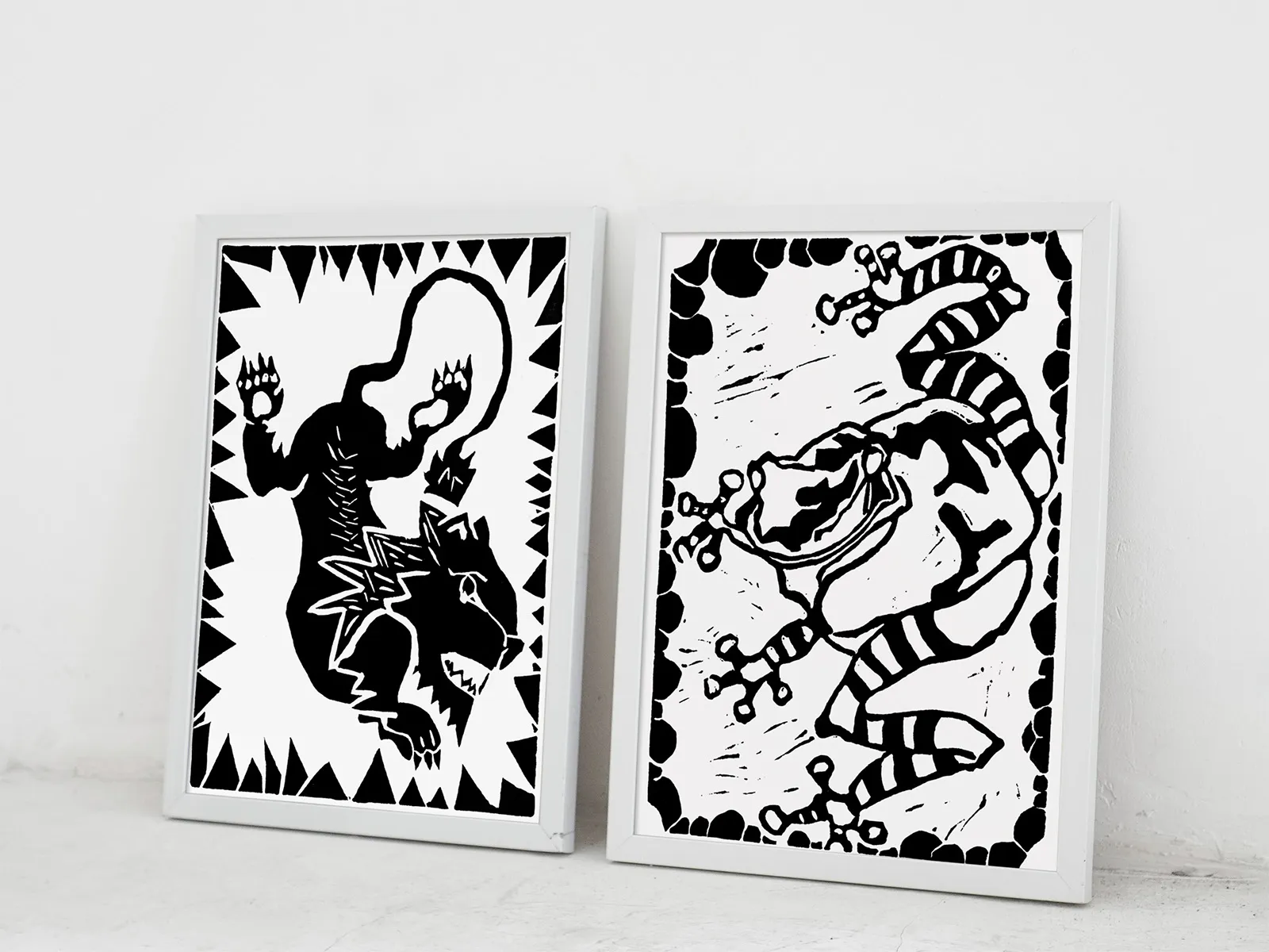 • Les tirages sont réalisés à la main, dans mon atelier, sur du papier Gerstaecker - 100g/m2, à l’encre noire Essdee.