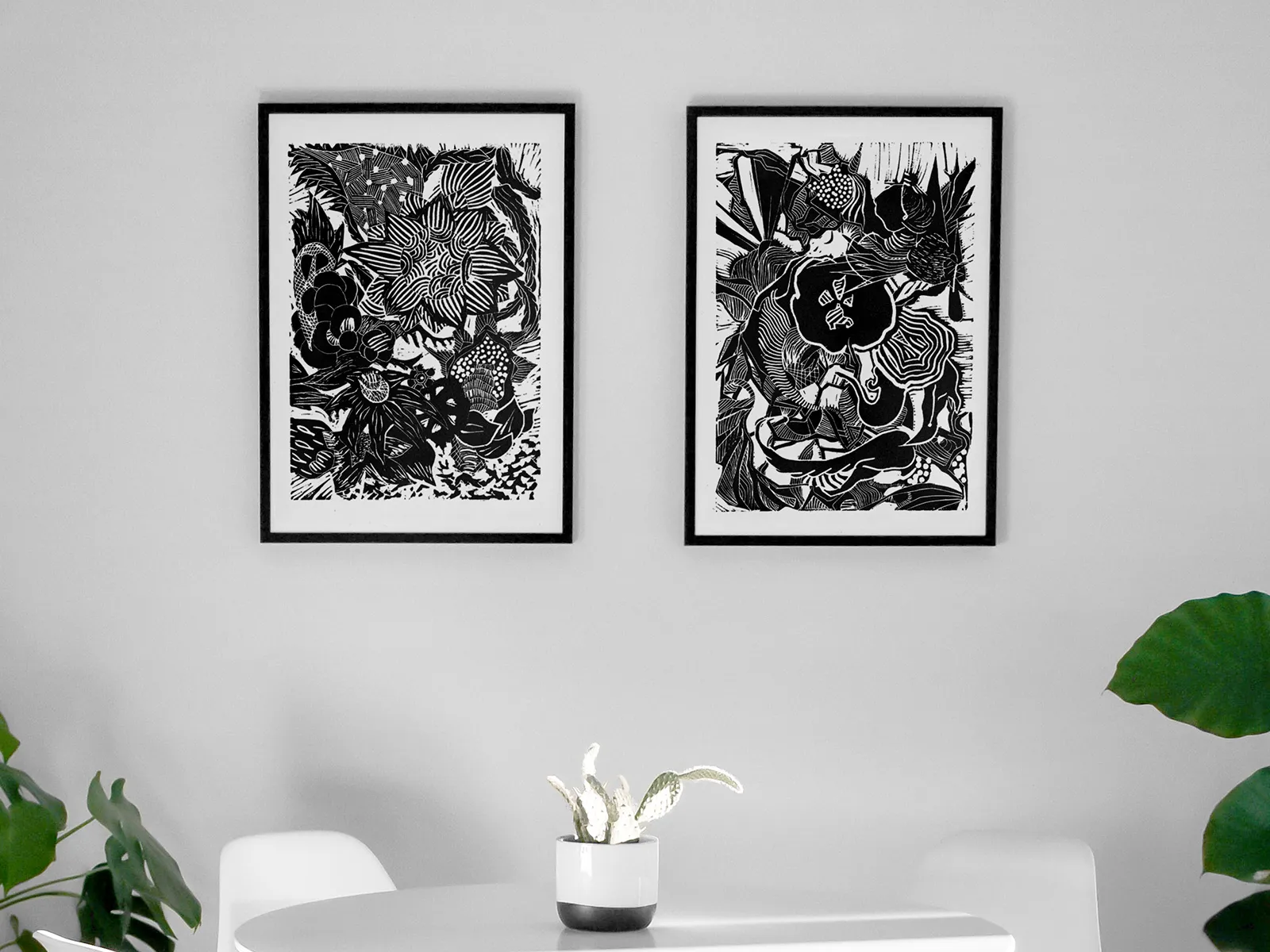 • Les tirages sont réalisés à la main, dans mon atelier, sur du papier Gerstaecker - 100g/m2, à l’encre noire Essdee.