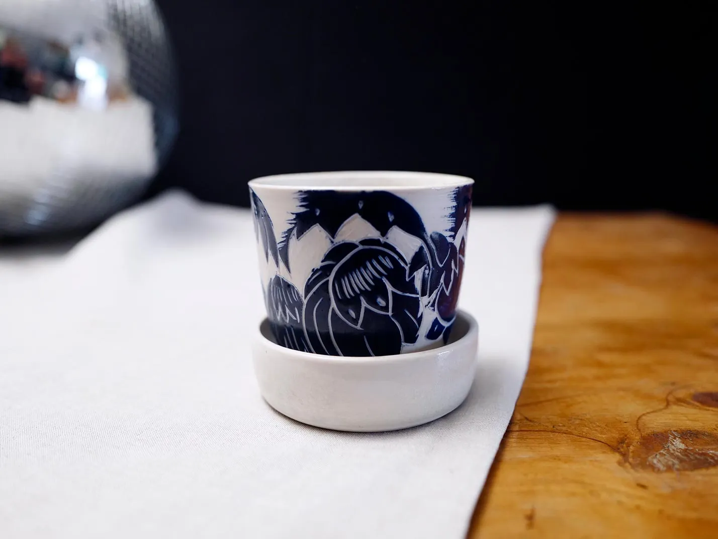 De forme simple, légèrement évasée, vous pourrez y glisser vos pots en plastique ou directement rempoter vos plantes dedans. Ce pot d efleur est accompagné de sa coupelle assortie. Son décor est bleu intense, légèrement satiné. Les motifs Édena qui s'y déploient, sont inspirés par une nature exubérante et luxuriante, parfois fantasmée.