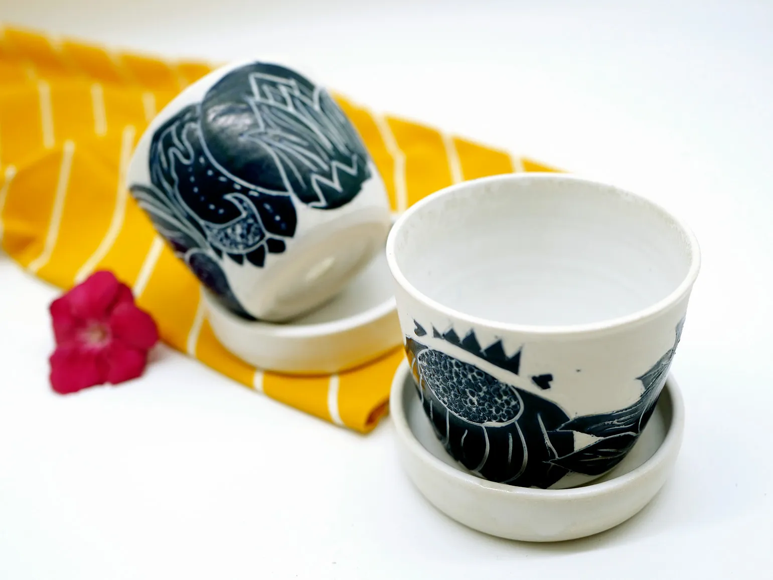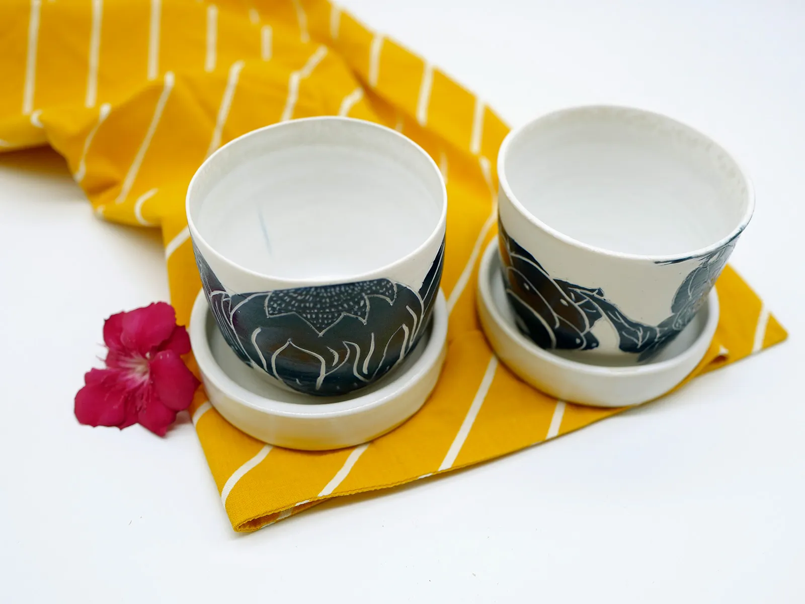 De forme simple, légèrement évasée, vous pourrez y glisser vos pots en plastique ou directement rempoter vos plantes dedans. Ce duo de cache-pot est accompagné de leurs coupelles assorties. Leurs décors sont bleu intense et satiné. C'est le bleu Nyx. J'y ai gravé les motifs Édena qui se déploient sur leurs parois. Ils sont inspirés par une nature exubérante et luxuriante, parfois fantasmée.
