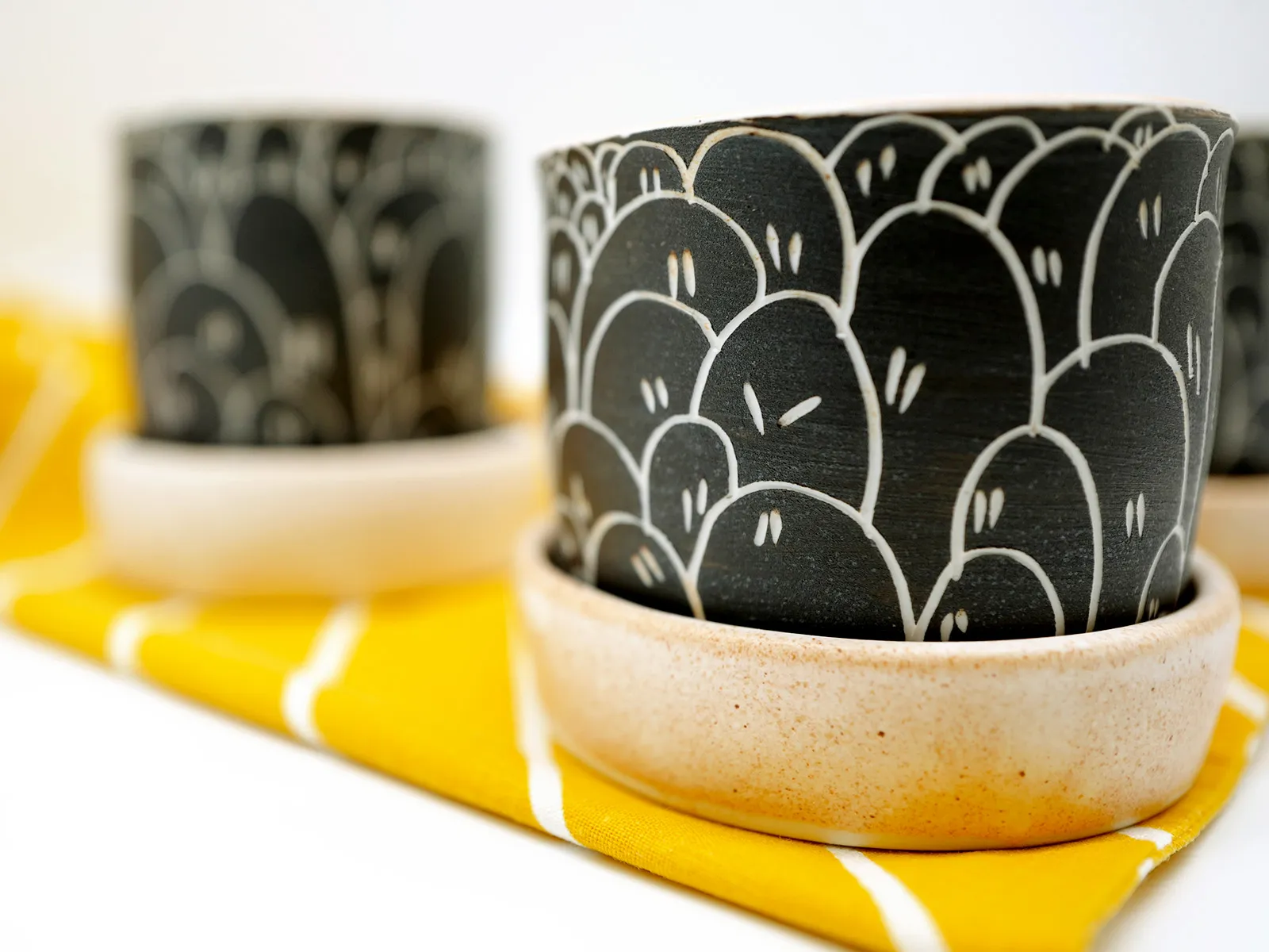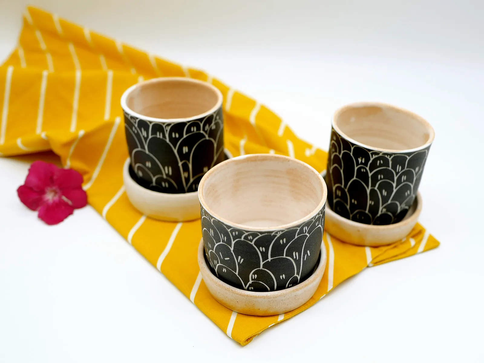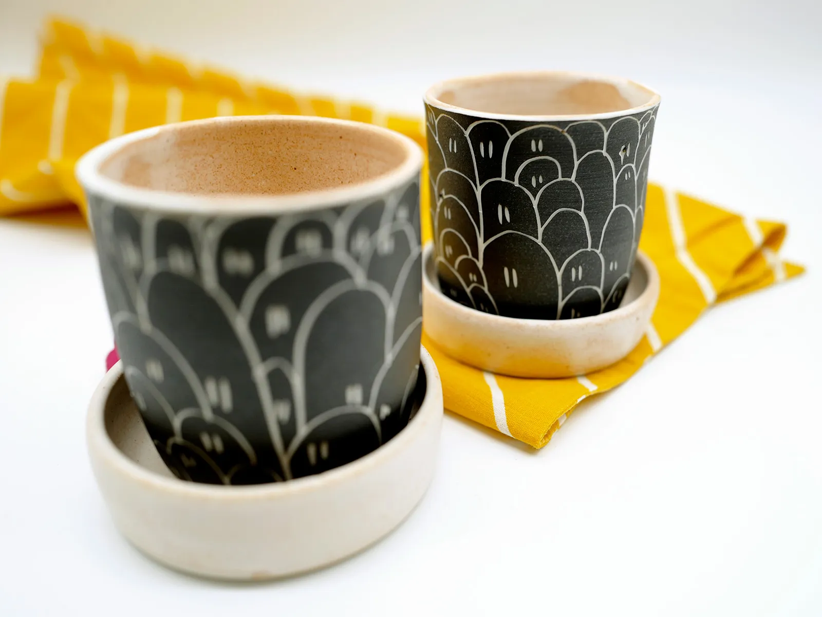 De forme simple, ces petits pots de fleur sont accompagnés de leurs coupelles assorties. Son décor est noir intense et mat. Le décor est une foule silencieuse. Légèrement évasée, vous pourrez y glisser vos pots en plastique ou directement rempoter vos plantes dedans.