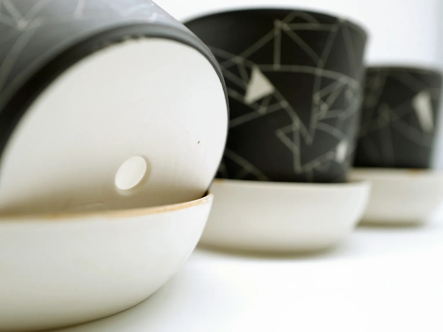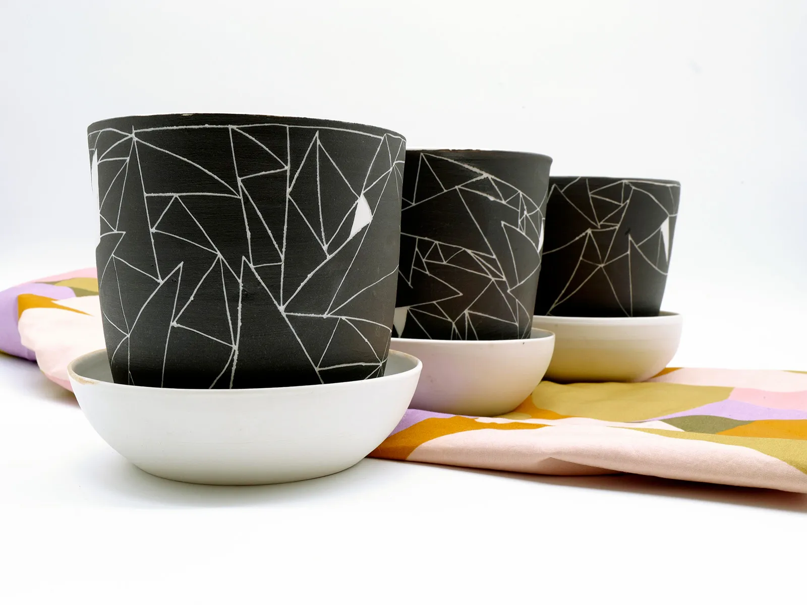 Décor parsemé de triangle avec ce pot de fleur munie d'une large coupelle émaillée. Vos plantes vertes vont adorer être rempotées dedans.