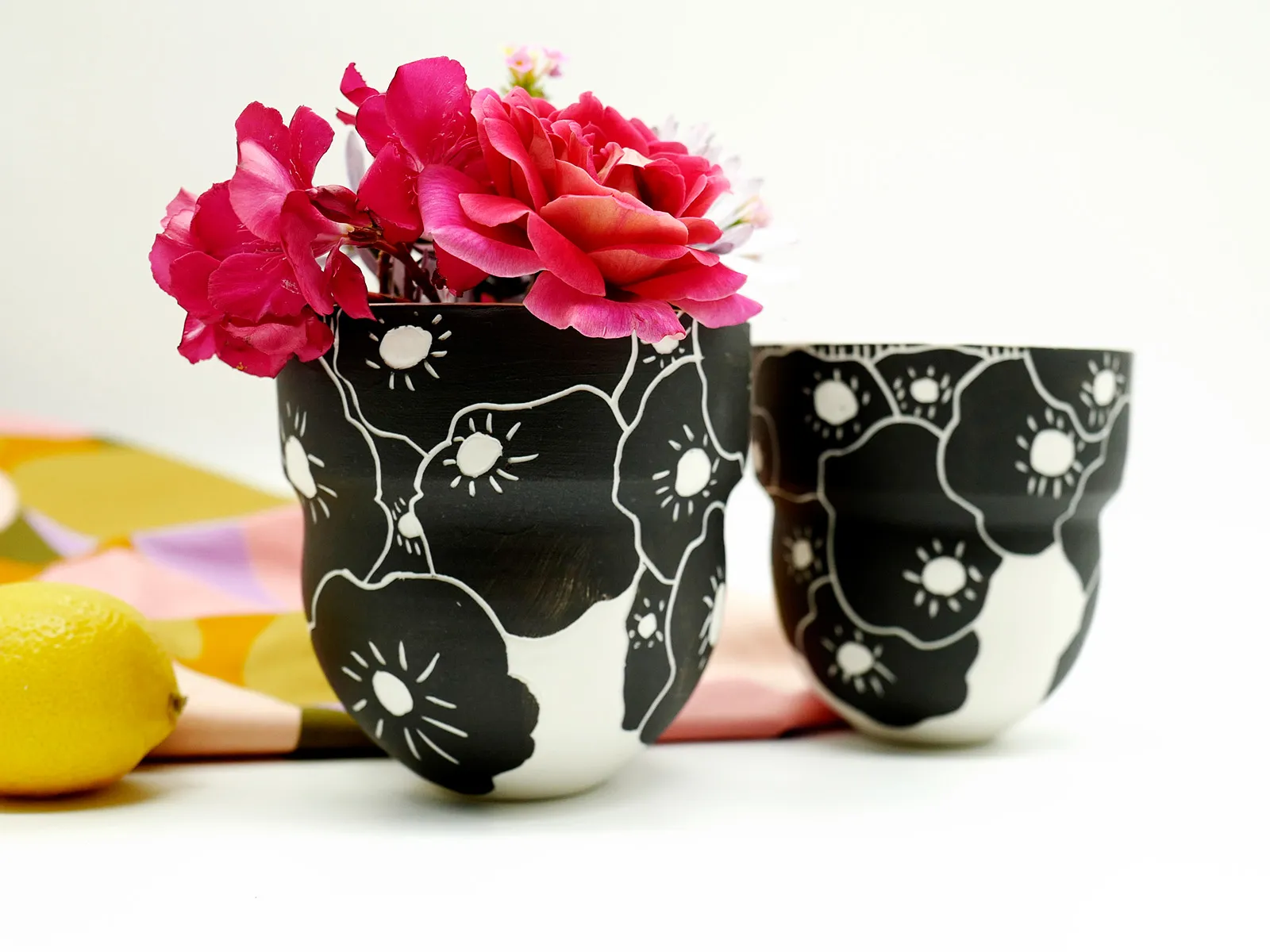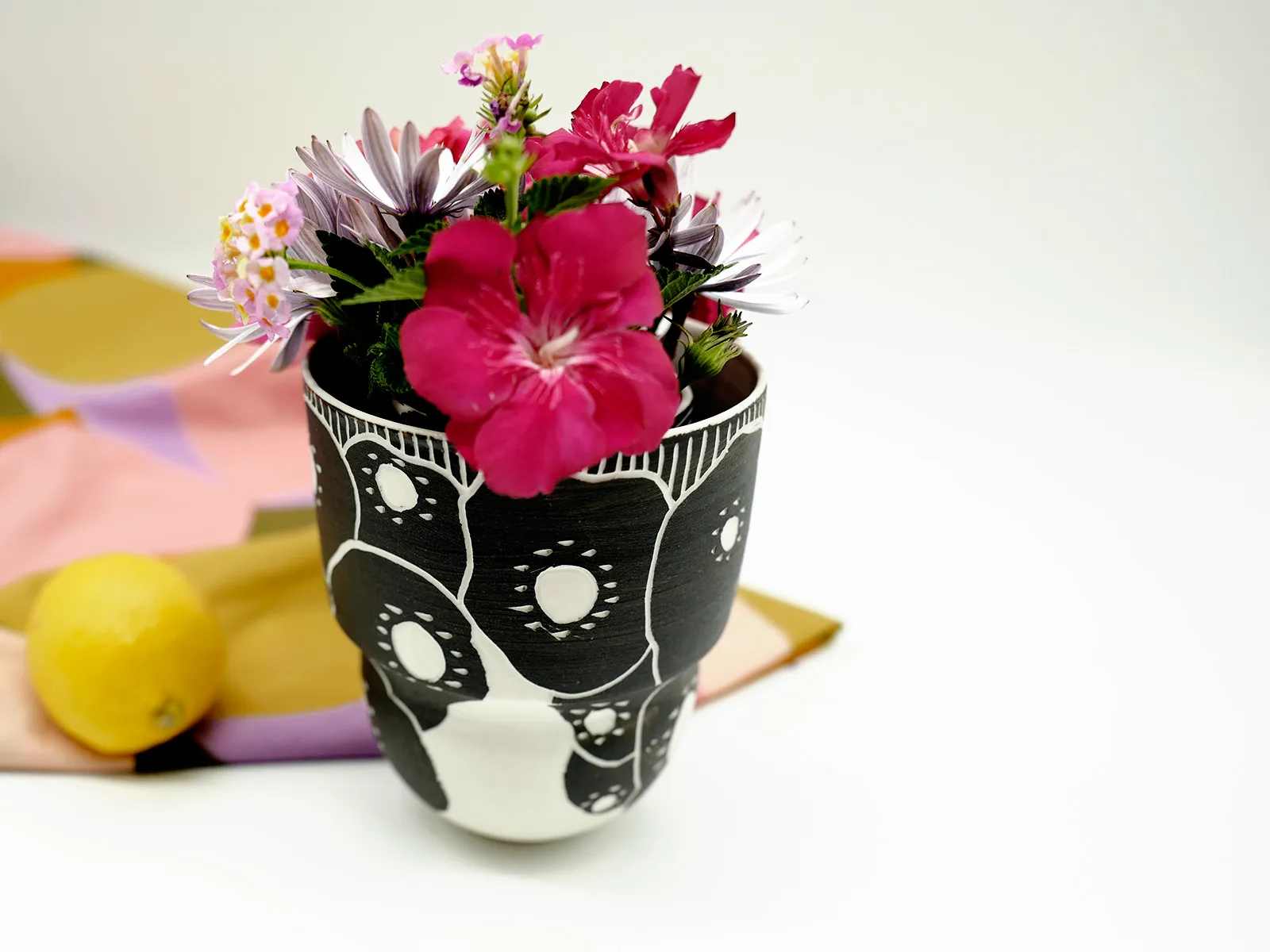 Vase de porcelaine, sa forme ouverte permet au décor de se déployer. Jouant sur le contraste du noir et blanc pour mettre en valeur vos bouquets. L'intérieur est émaillé en blanc.