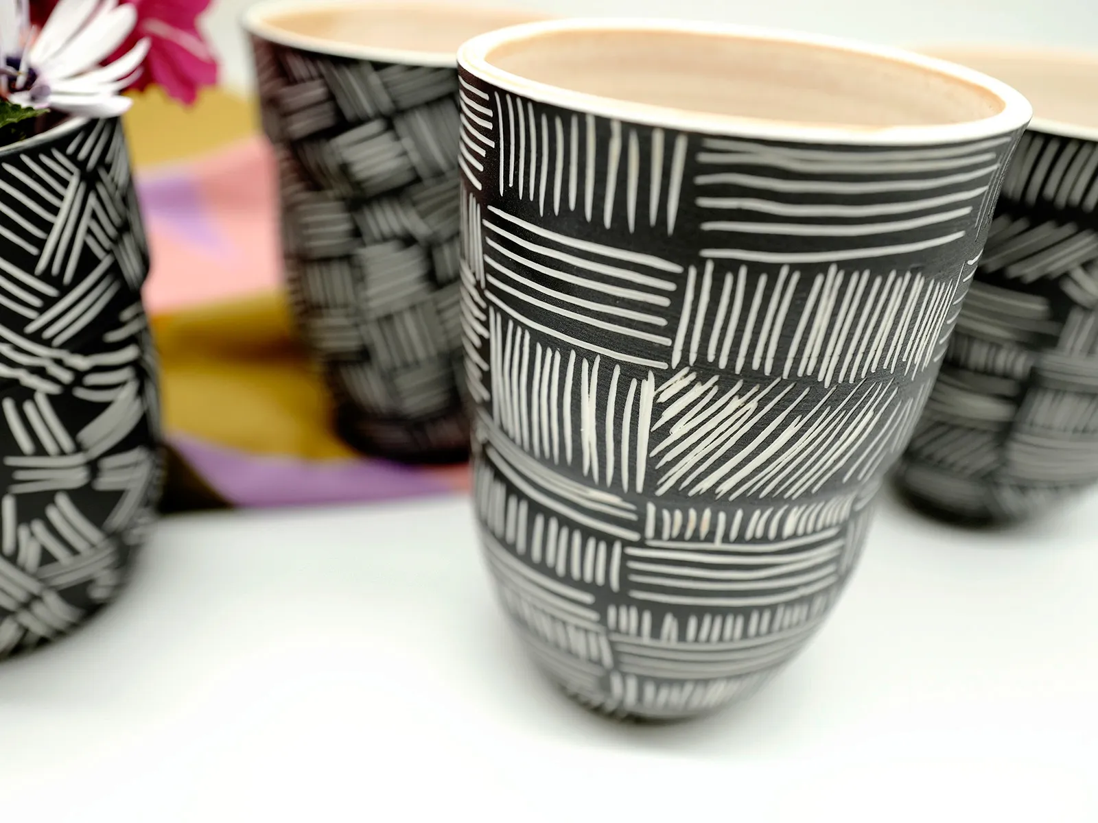 Vase de porcelaine jouant sur le contraste du noir et blanc pour mettre en valeur vos bouquets. L'intérieur est émaillé en blanc. Son décor "griffé" sera créer l'harmonie dans votre intérieur.